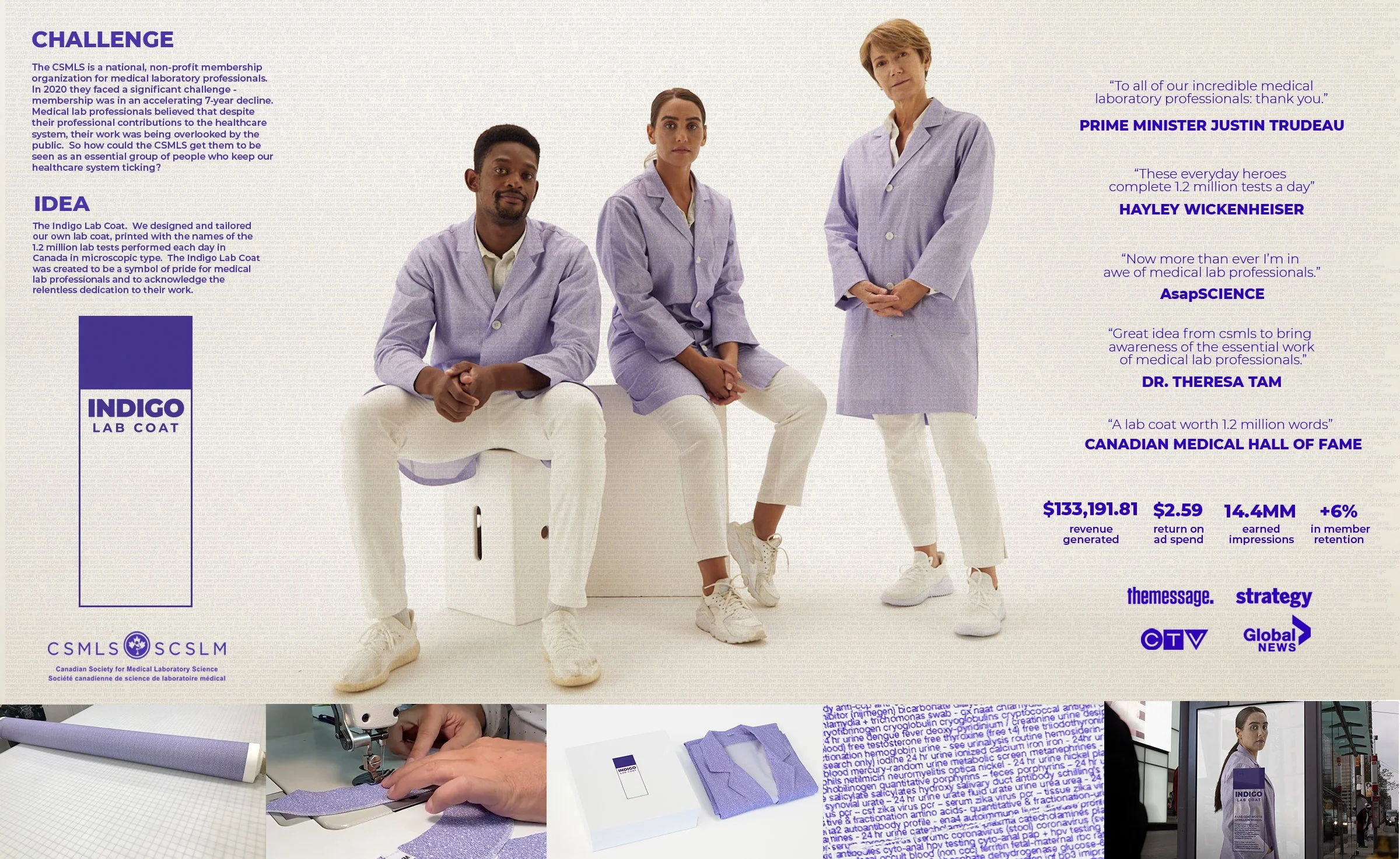 The Indigo Lab Coat was created to champion and celebrate the tireless efforts made by the members of the Canadian Society of Medical Science (CSMLS) through the pandemic.